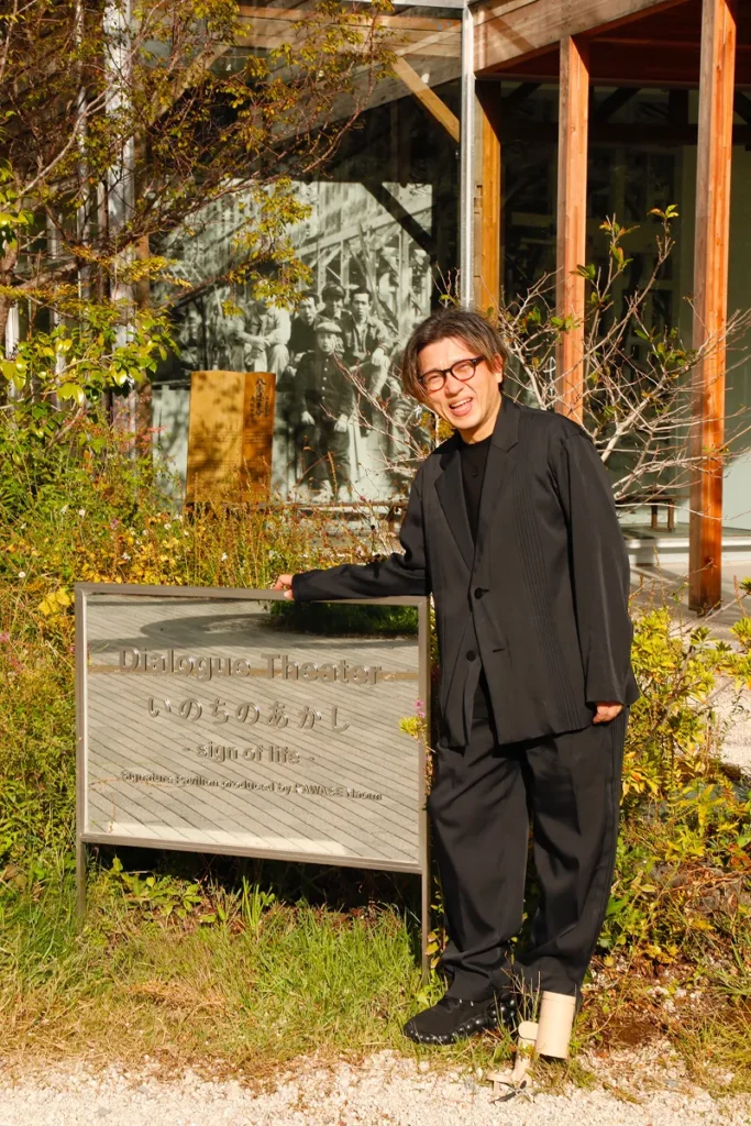 映画監督の河瀨直美さんがプロデューサーを務めたシグネチャーパビリオン「いのちのあかし」で、私は計画統括ディレクターとして並走しました。万博というと、展示で答えを提示する場だと思われがちですが、私たちのパビリオンでは展示物を並べるのではなく、映画館のような空間で、スクリーン越しに「会場にいる一人」と「世界のどこかにいる一人」が、初めて出会い、10分間だけ対話をする。リアルタイムに繰り広げられるのは、編集不可能なドキュメンタリーです。最初は緊張している二人が、言葉を交わす中で少しずつ心を開いていく。その空気の変化を、観客も話者もスタッフも、固唾を呑みながら空間全体で共有する体験です。